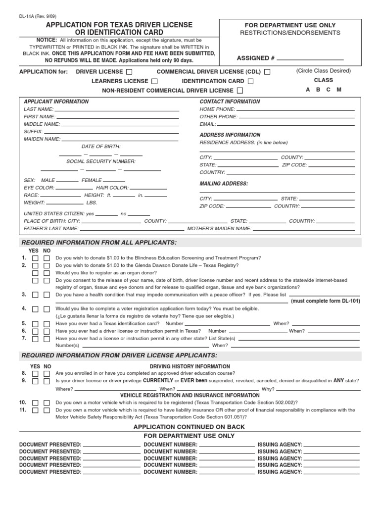Dl 14A Form Texas - The information on this application is required by the texas driver license act, texas transportation code chapter 521. La información de esta solicitud se requiere según la ley de licencias de conducir de texas, código de transporte de texas, capítulo 521.