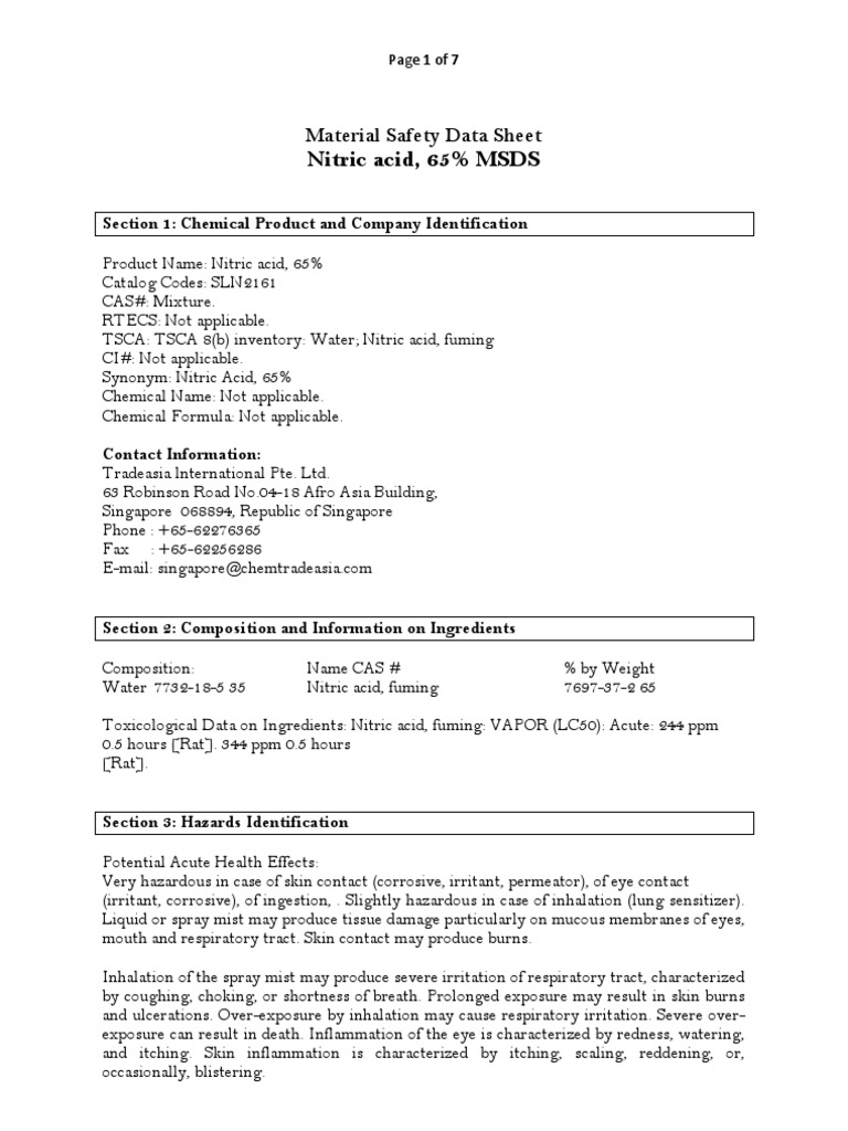 Material Safety Data Sheet Nitric Acid PDF Toxicity Nitric Acid