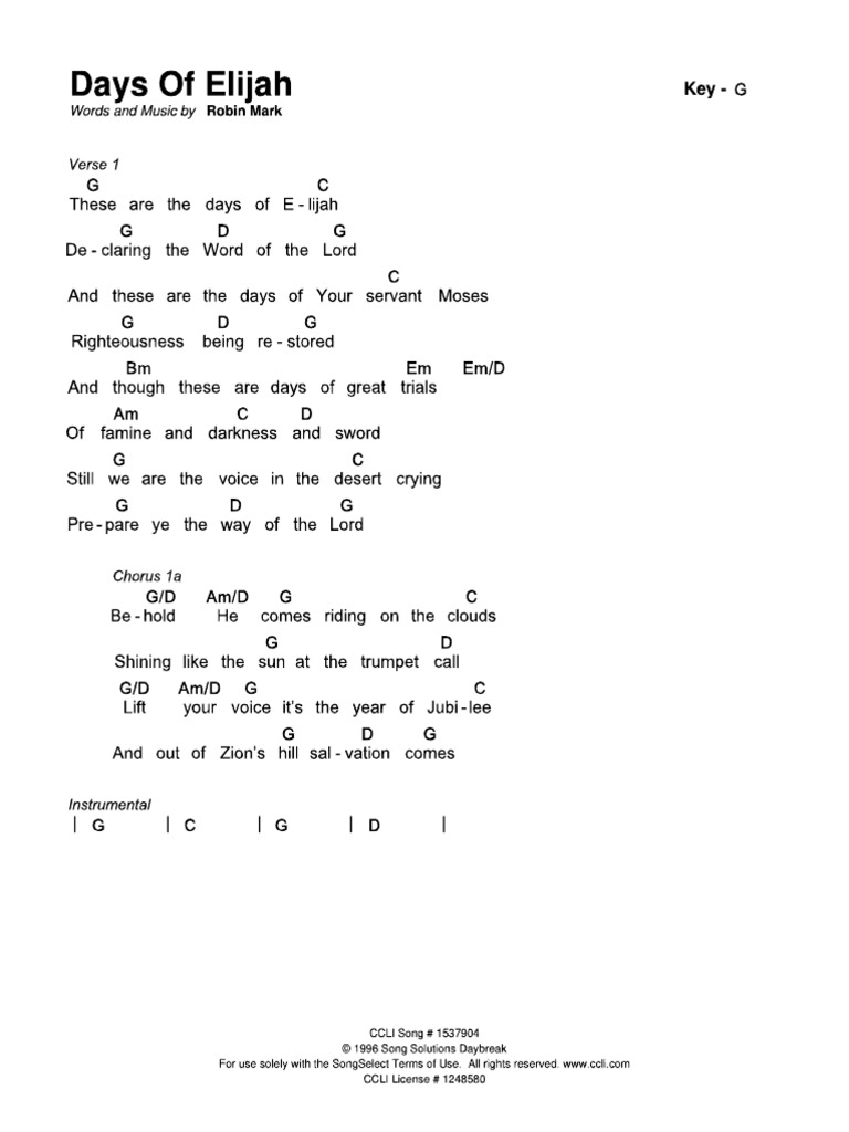 Days Of Elijah" Sheet Music by Robin Mark for Piano/Vocal/Chords